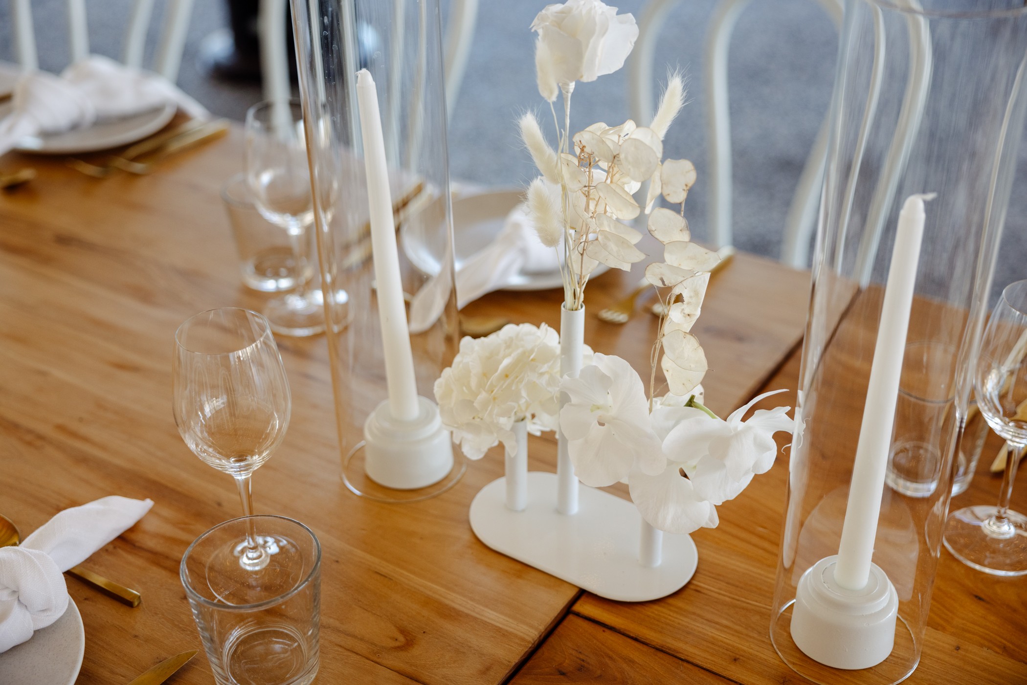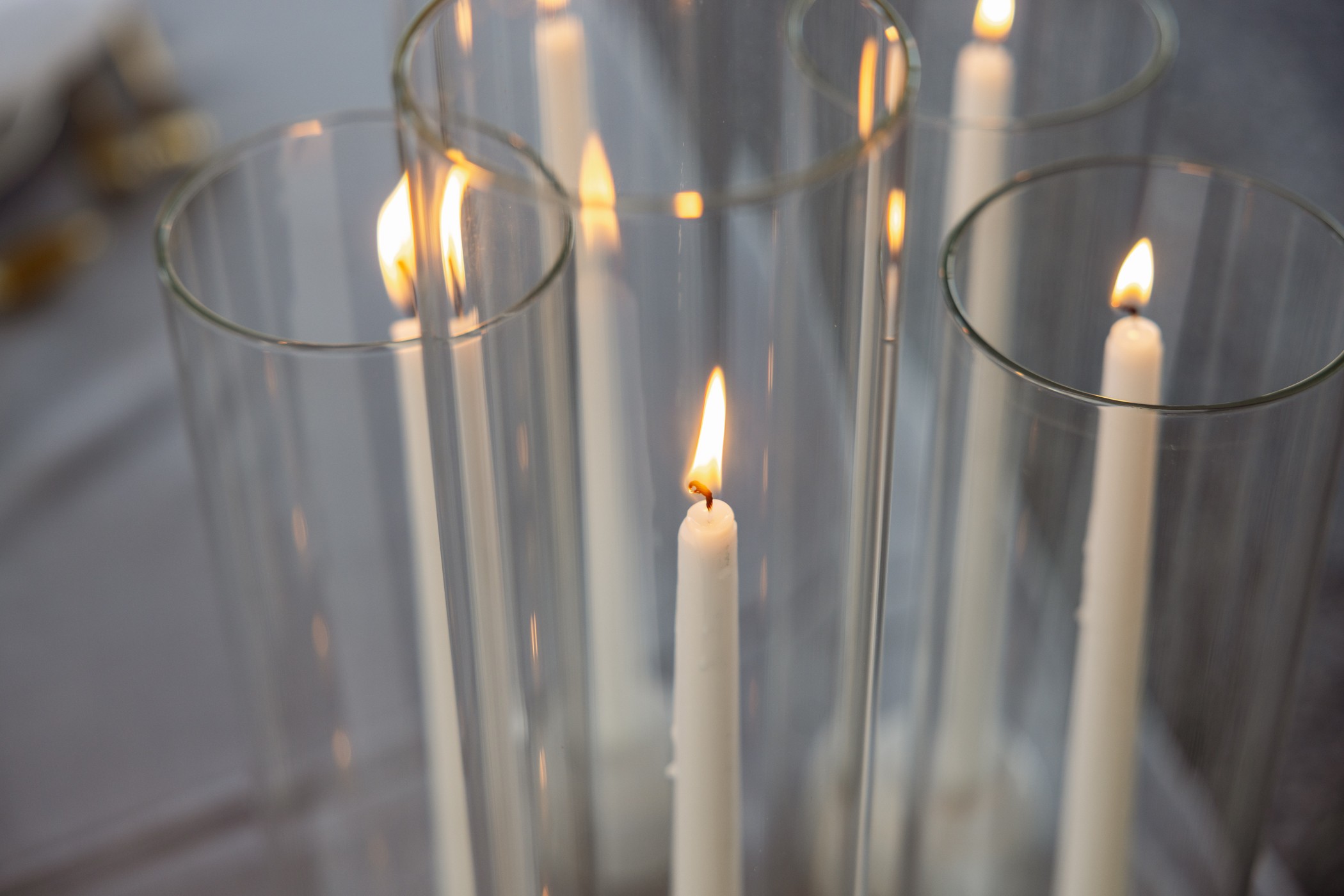 Sleek and sophisticated, our Glass Cylinder Candle Covers with White Holders are the perfect addition to elevate your event lighting. Designed to hold both stick candles and tea lights, these covers provide a soft, flickering glow while adding a clean, modern aesthetic to your tablescape or ceremony setup. Ideal for weddings, dinner parties, and contemporary events, they offer both safety and style in one elegant piece.