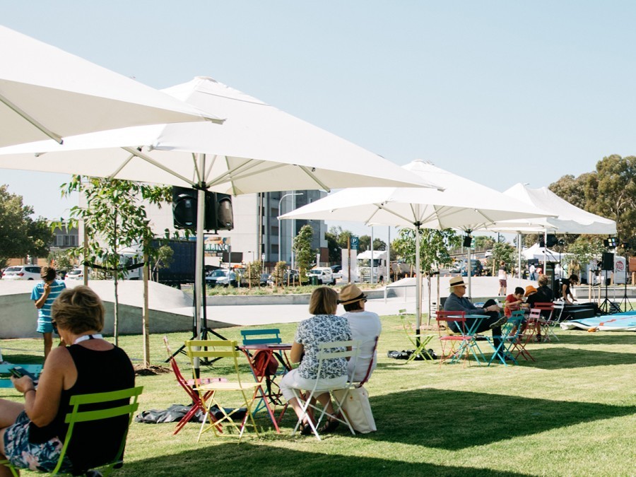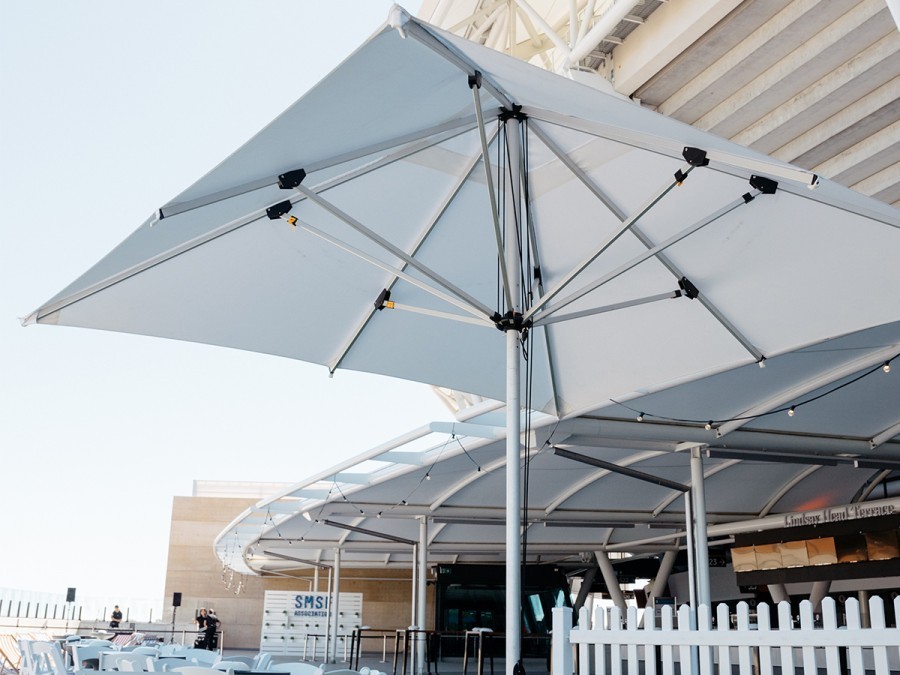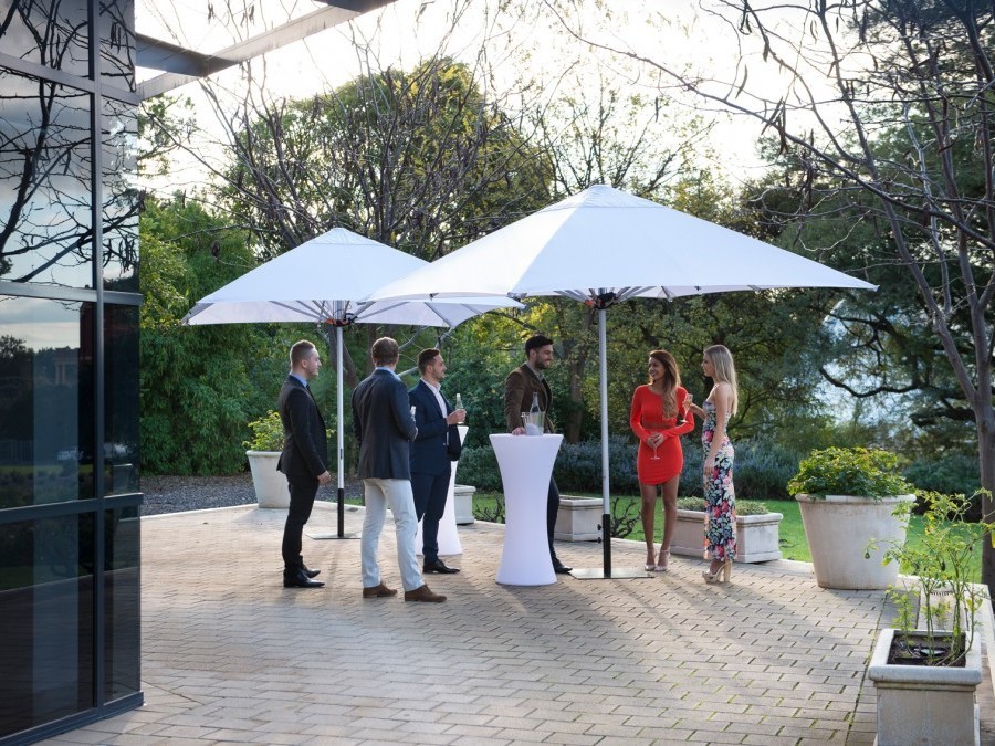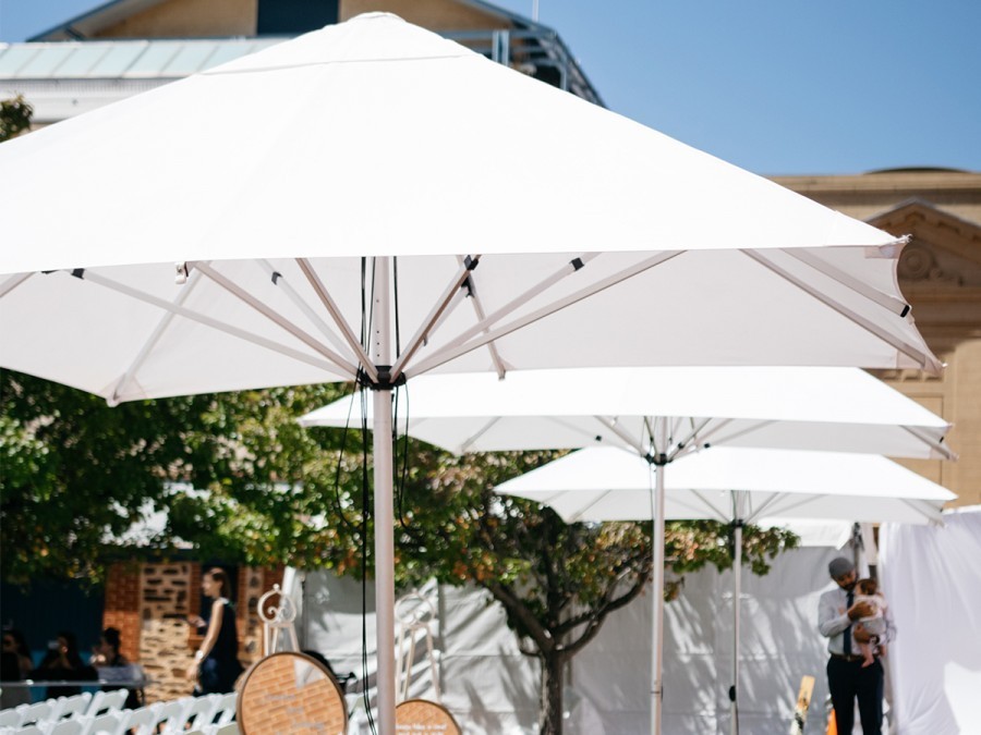 Don’t chase the shade, create it with our centre-post umbrellas. Ideal for any outdoor event, our umbrellas provide coverage of three-by-three meters in an eye catching design that is water repellant and UV resistant (SPF50+). Consisting of a white top, silver aluminum post and black base, these sturdy umbrellas are of unbeatable quality. Each umbrella comes with sandbags for weighting the structure in place and the centre-post, stand alone design means they can be easily erected on any flat surface. A must for any outdoor event, our umbrellas are the perfect way to protect guests from the elements without compromising on style.