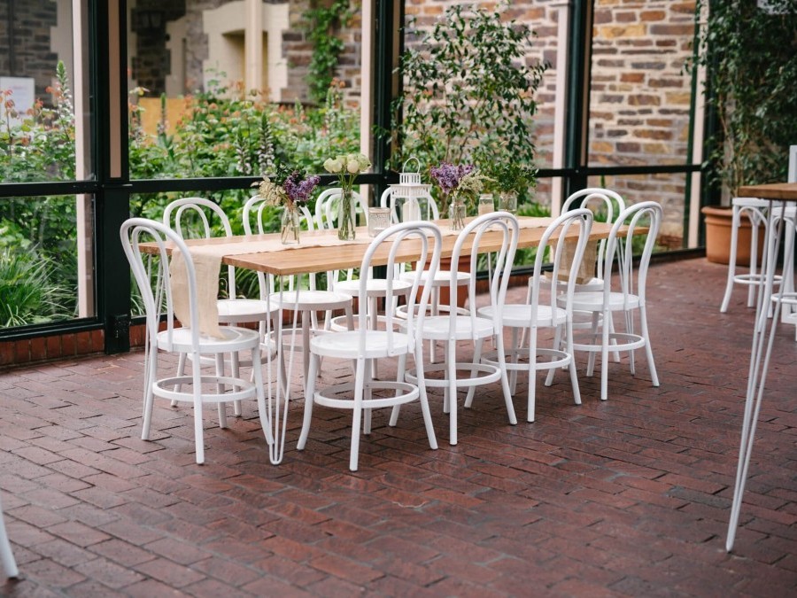 Our Hairpin dining tables are the point of difference for your next dining experience. With an oak wood, white or black finish, our Hairpin dining tables seat eight comfortably and can easily be joined for larger groups. Coloured legs add an element of fun, with classic white or black beautifully complementing any dining experience where elegance is key. Hire in conjunction with our Cleo furniture and gold or copper cutlery for an eye catching set up that guests will love.