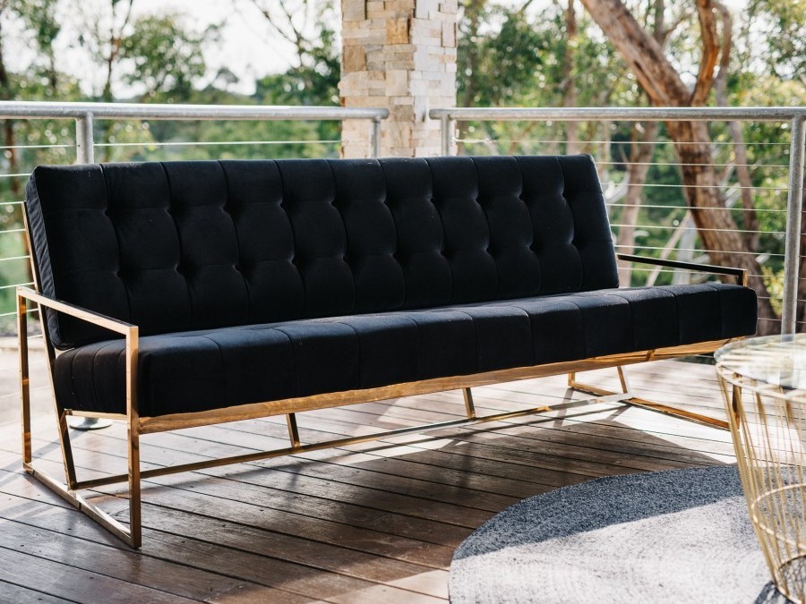 Sleek in design, our Zara Lounge is the perfect mix of comfort and style. Made from velvet textured fabrics, our Zara Lounge comfortably seats three and is available in a range of high impact colours. Available with gold or black metallic frames, our Zara Lounge boasts subtle rivet detailing reminiscent of the popular Chesterfield Sofas. Hire in conjunction with our Zara Armchair for an irresistible lounge area, or mix and match with our Harper and Cleo collections for a space that guests won’t want to leave.